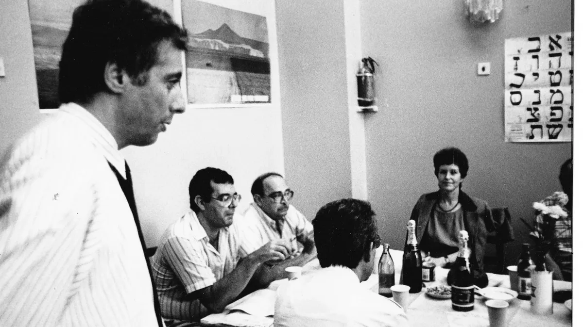 Историческая фотография с церемонии открытия «Сохнута» в Москве с участием председателя Еврейского агентства Симхи Диница. 1991 год, февраль. Специально для «Новой газеты. Европа»