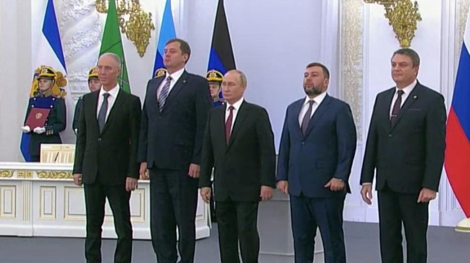 Президент Владимир Путин и «главы» самопровозглашенных ДНР и ЛНР, а также назначенные Россией главы Запорожской и Херсонской областей Денис Пушилин, Леонид Пасечник, Евгений Балицкий и Владимир Сальдо подписали договоры о присоединении территорий к РФ 30 сентября.