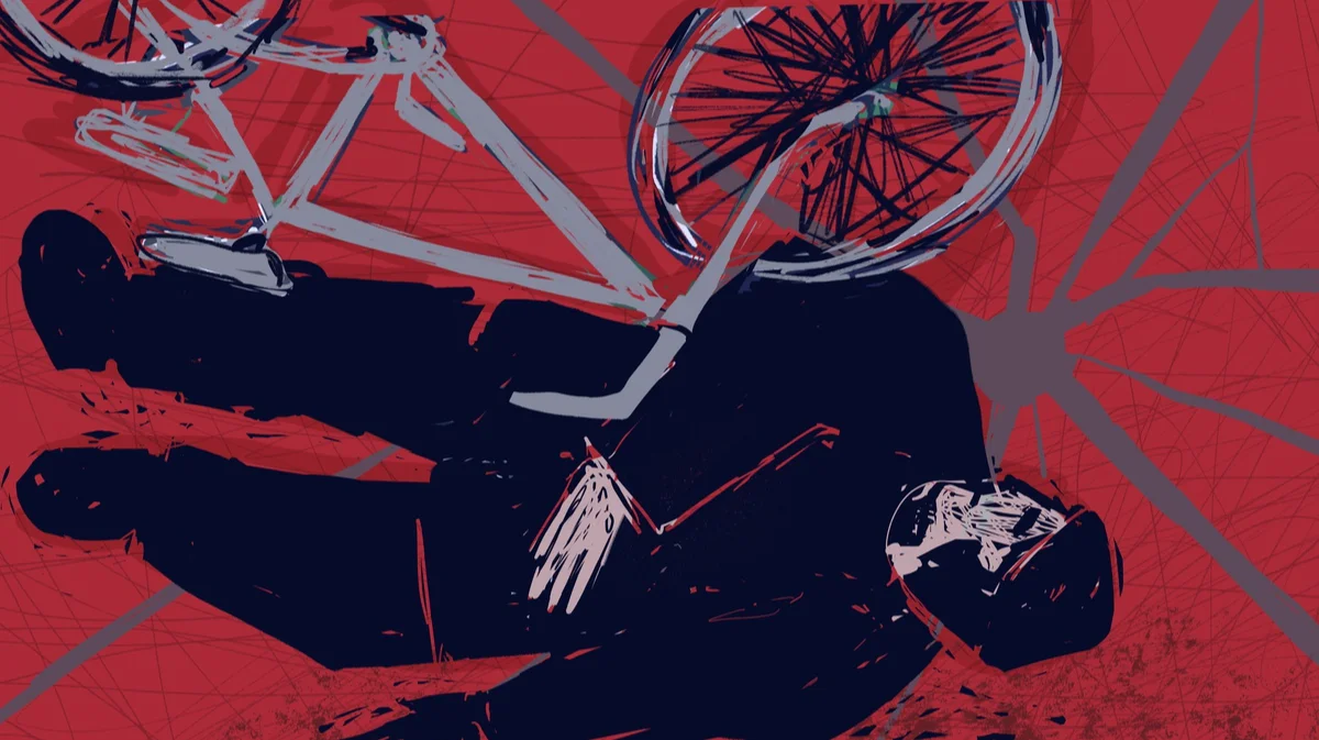 Велосипедист в оранжевых нитяных перчатках, такие обычно носят строители, лежит навзничь на проезжей части улицы Яблуньской. Рядом — часть ограды с кирпичными колоннами, указатель «Таунхаусы» (недвижимость в Буче всегда пользовалась спросом), воронка от прилета, залитая талой водой, и фрагменты чего-то сгоревшего. В перспективе удаляются мужские фигуры, тоже с велосипедами, главным местным транспортом времен оккупации… За время оккупации здесь убили не одного велосипедиста.