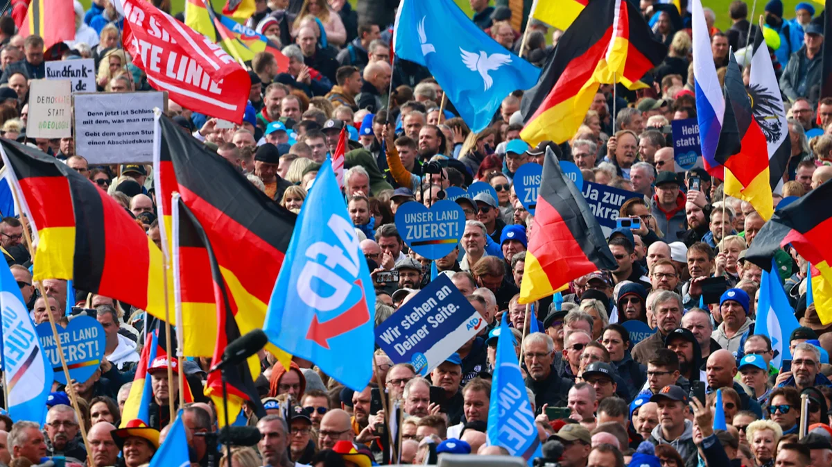 Сторонники популистской ультраправой партии «Альтернатива для Германии» протестуют перед зданием Рейхстага в Берлине, Германия, 8 октября 2022 года. Фото: Hannibal Hanschke / EPA-EFE