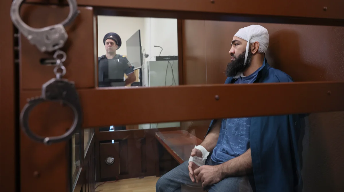 Умар Чичаев, обвиняемый по делу о стрельбе в Wildberries, в клетке для обвиняемых во время избрания для него меры пресечения на заседании Басманного районного суда Москвы, 20 сентября 2024 года. Фото: Максим Шипенков / EPA-EFE