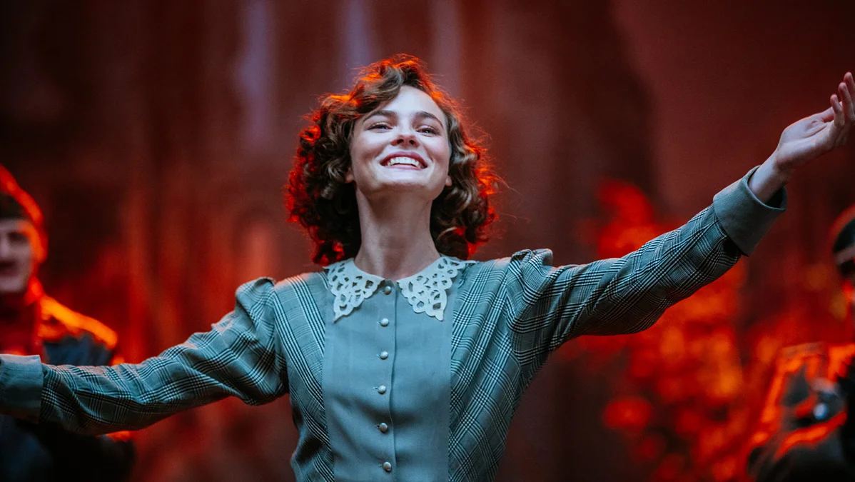 «Любовь» лихо мимикрирует под кино той страшной эпохи. В кадре все непрерывно улыбаются и машут, словно в мюзиклах Александрова. Треть хронометража занимают виды «похорошевшей» благодаря CGI Москвы. Таким помпезным сталинский ампир не был даже на открытках: монструозные серпы и молоты торчат изо всех щелей, мимо Кремля мчатся блестящие кабриолеты, в то время как в безоблачном небе порхают дирижабли. «Сталинки» с панорамными видами перекачаны роскошью, а живущие там селебрити разодеты так, словно перед нами спешл «Эмили в Париже». Война же сводится к сентиментальным проводам на вокзале и не менее слезливому воссоединению после. Потому что победу, конечно же, одержал не народ, но Сталин, задумчиво сгорбившийся над гигантской картой.