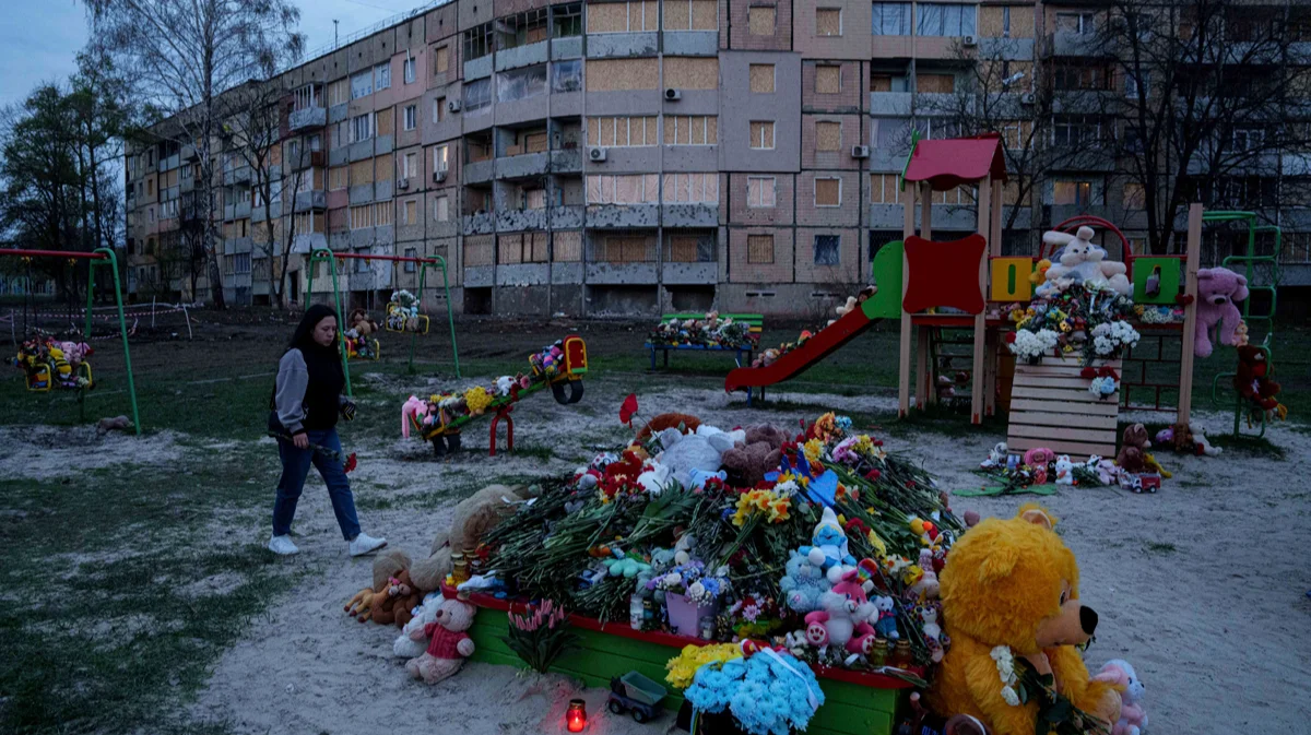 Женщина возлагает цветы на детскую площадку, где в результате ракетного удара погибли 20 человек, включая 9 детей, Кривой Рог, 7 апреля 2025 года. Фото: Evgeniy Maloletka / AP Photo / Scanpix / LETA