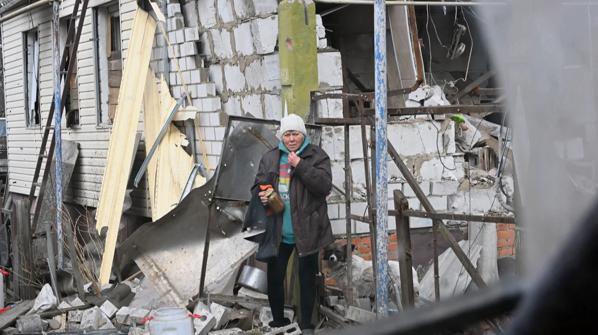 Женщина стоит у разрушенного от обстрела жилого кирпичного дома в Судже, 19 марта 2025 года. Фото: Анатолий Жданов / Коммерсантъ / Sipa USA / Vida Press