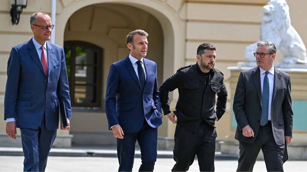 Канцлер Германии Фридрих Мерц, президент Франции Эммануэль Макрон, президент Украины Владимир Зеленский и премьер-министр Великобритании Кир Стармер после встречи «коалиции желающих» в Мариинском дворце, Киев, Украина, 10 мая 2025 года. Фото: Darek Delmanowicz / EPA