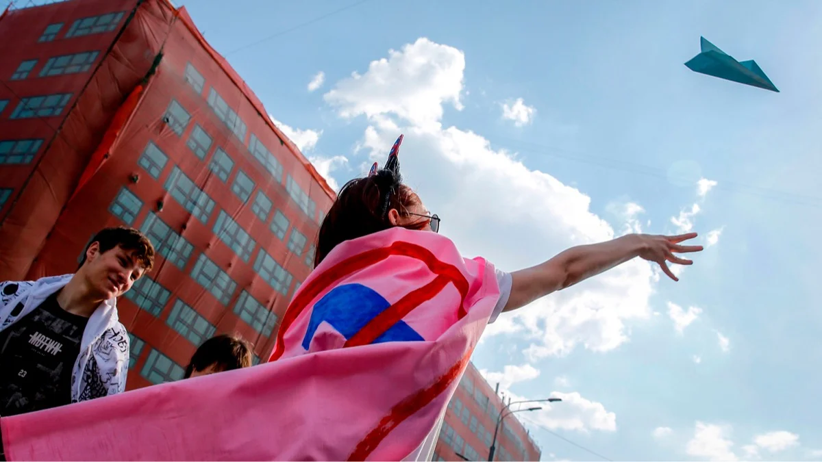 Участница запускает бумажный самолетик, символ мессенджера Telegram, Москва, 13 мая 2018 года. Фото: Максим Змеев / AFP / Scanpix / LETA