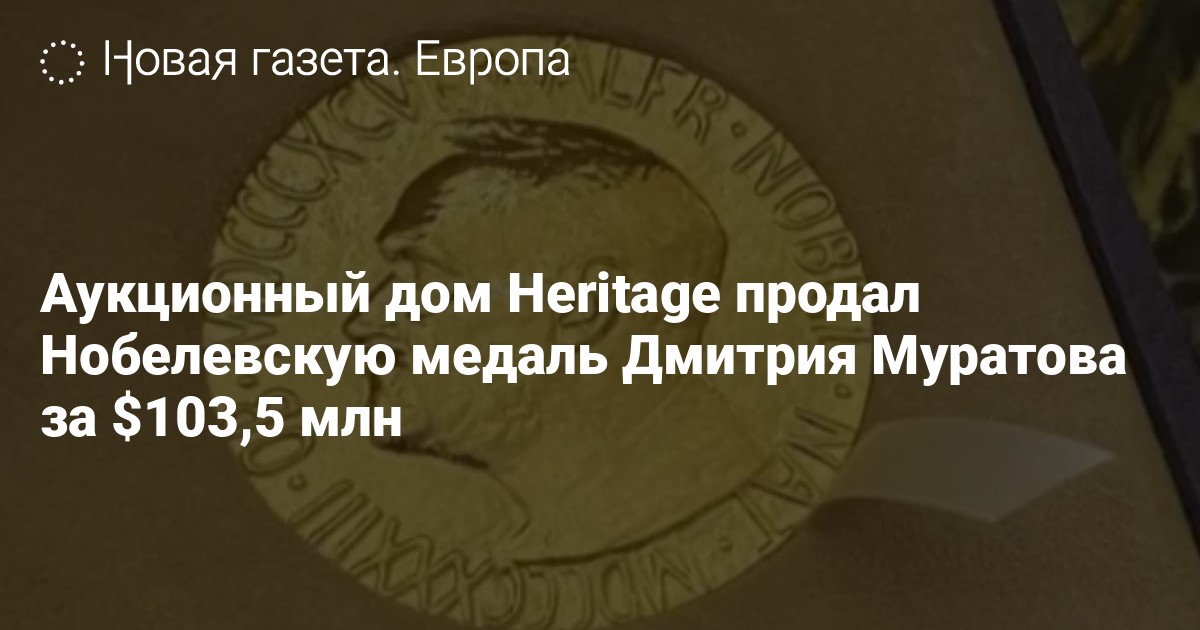 Американский аукционный дом Heritage Auctions продал на аукционе в Нью-Йорке Нобелевскую медаль премии мира 2021 года главного редактора «Новой газеты» Дмитрия Муратова за $103,5 млн.