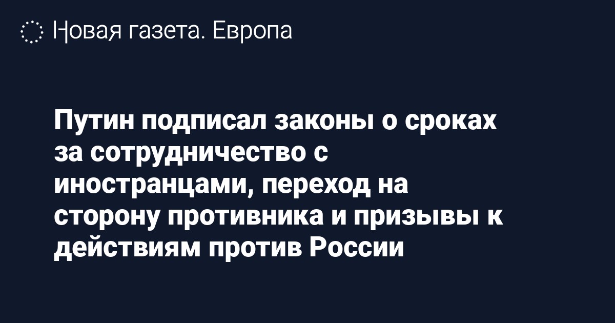Путин подписал законы о сроках за сотрудничество с иностранцами, переход на сторону противника и призывы к действиям против России
