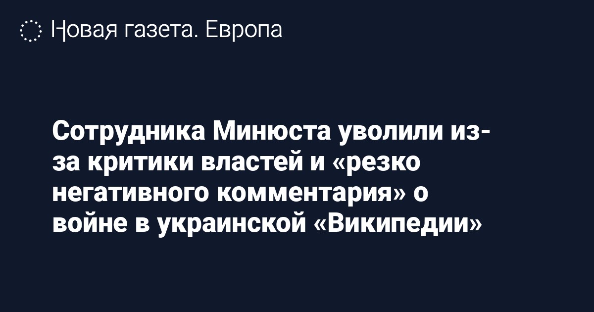 Юриста Министерства юстиций Николая Колпакова уволили из-за критических высказываний в адрес действующей власти в России и «резко негативного комментария» о войне в украинской «Википедии».» Об этом он рассказал «Роскомсвободе» и «Медиазоне».