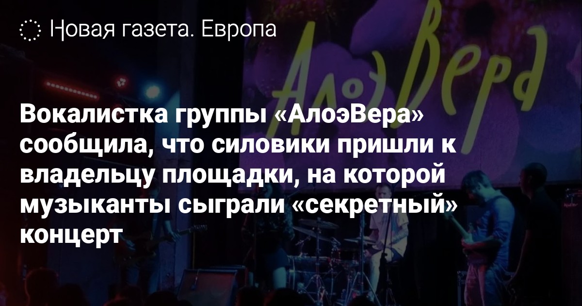 Вокалистка группы «АлоэВера» Вера Мусаелян рассказала, что сотрудники ФСБ пришли к владельцу концертной площадки, где группа выступила с «секретным» концертом после отмены официального выступления. Об этом сообщает «Медуза» со ссылкой на Мусаелян.