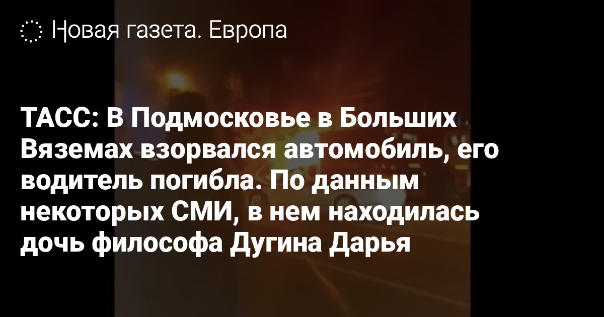 ТАСС: В Подмосковье в Больших Вяземах взорвался автомобиль, его водитель погибла. По данным некоторых СМИ, в нем находилась дочь философа Дугина Дарья
