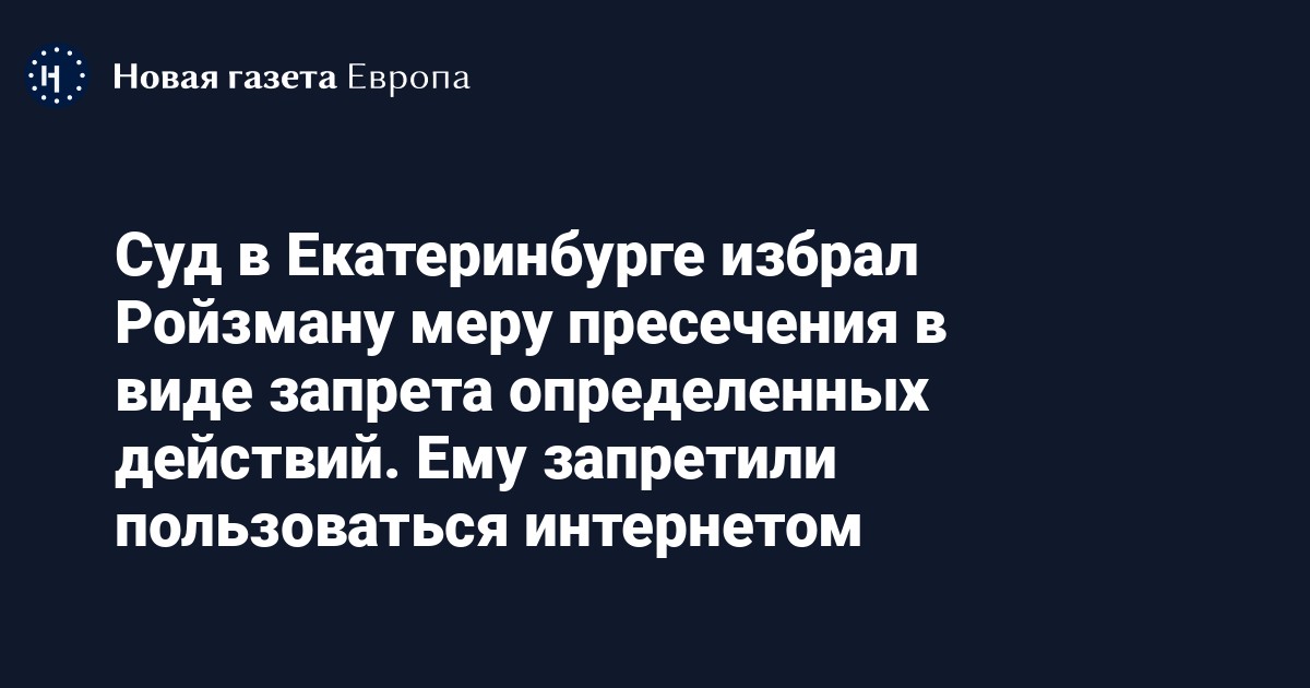 Верх-Исетский районный суд Екатеринбурга запретил бывшему мэру Екатеринбурга Евгению Ройзману пользоваться средствами связи и интернетом в качестве меры пресечения по делу о «дискредитации» российской армии (ст. 280.3 УК).
