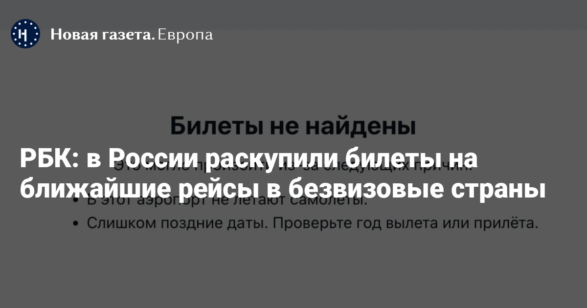 На ближайшие прямые рейсы из Москвы в страны, не требующие виз для въезда, закончились билеты. Об этом сообщает РБК со ссылкой на данные авиакомпаний и билетных агрегаторов.