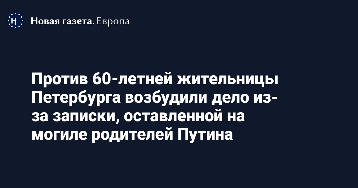 Против 60-летней жительницы Санкт-Петербурга Ирины Цыбаневой завели уголовное дело по статье о надругательстве над телами умерших и местами их захоронения (ч. 2 п. «б» ст. 244 УК) из-за записки, оставленной на могиле родителей президента РФ Владимира Путина. Об этом сообщает «Медиазона» со ссылкой на сына задержанной Максима Цыбанева.