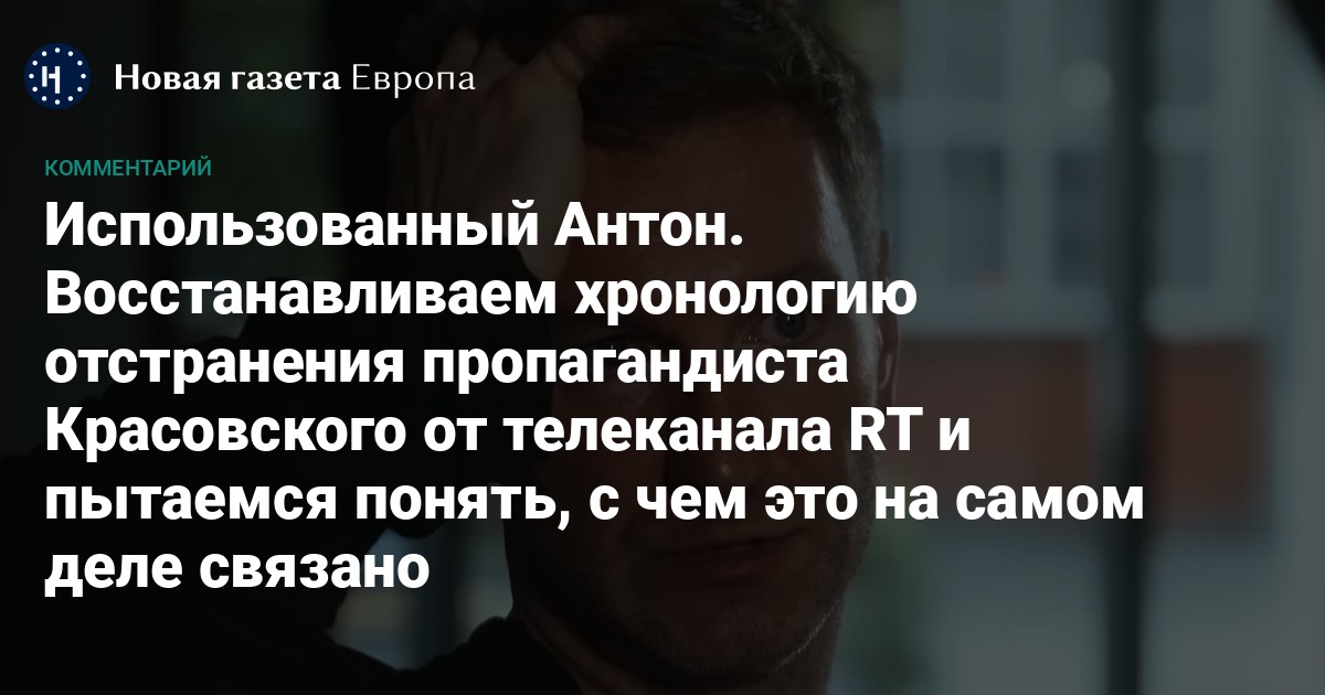 Журналист и бывший директор фонда «СПИД-Центр» Антон Красовский начал сотрудничать с телеканалом Russia Today в 2019 году. В октябре 2020 года Красовский занял должность директора вещания на русском языке, а в 2021-м стал ведущим авторской программы «Антонимы». В «Антонимах» журналист интервьюировал публичных персон: политиков, бизнесменов, деятелей культуры — а иногда и сам рассуждал о событиях новостной повестки. Одними из его последних гостей были артистка Надежда Бабкина и губернатор Севастополя Михаил Развожаев. С ними, как и с остальными гостями в последнее время, он обсуждал войну в Украине — конечно, с пророссийской точки зрения.
