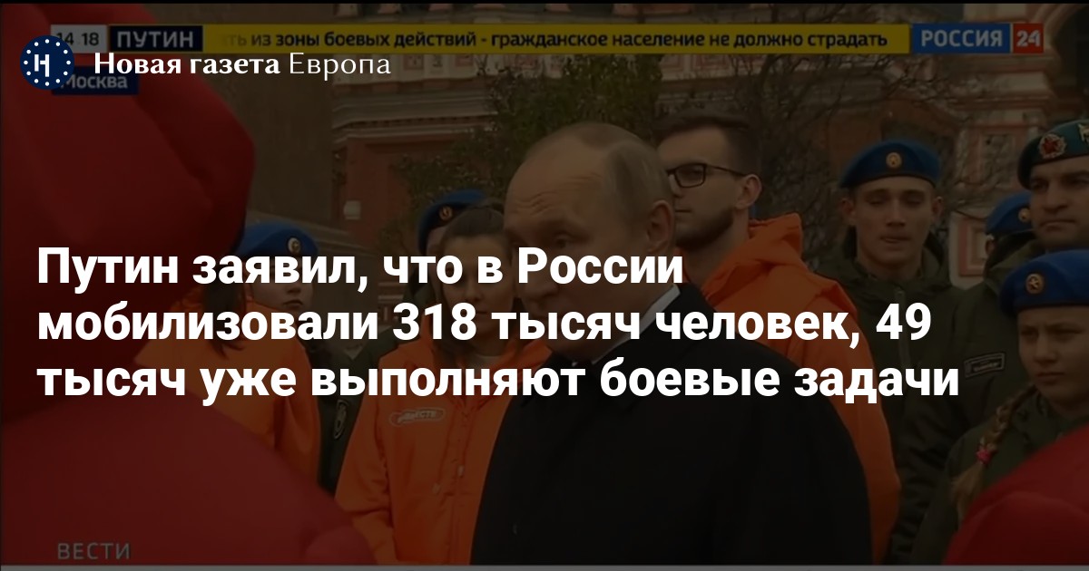 Президент России Владимир Путин объявил, что в России мобилизовали 318 тысяч человек, 49 тысяч из которых уже выполняют боевые задачи. Об этом он рассказал в ходе беседы с представителями молодежных волонтерских организаций у памятника Кузьме Минину и Дмитрию Пожарскому в Москве.