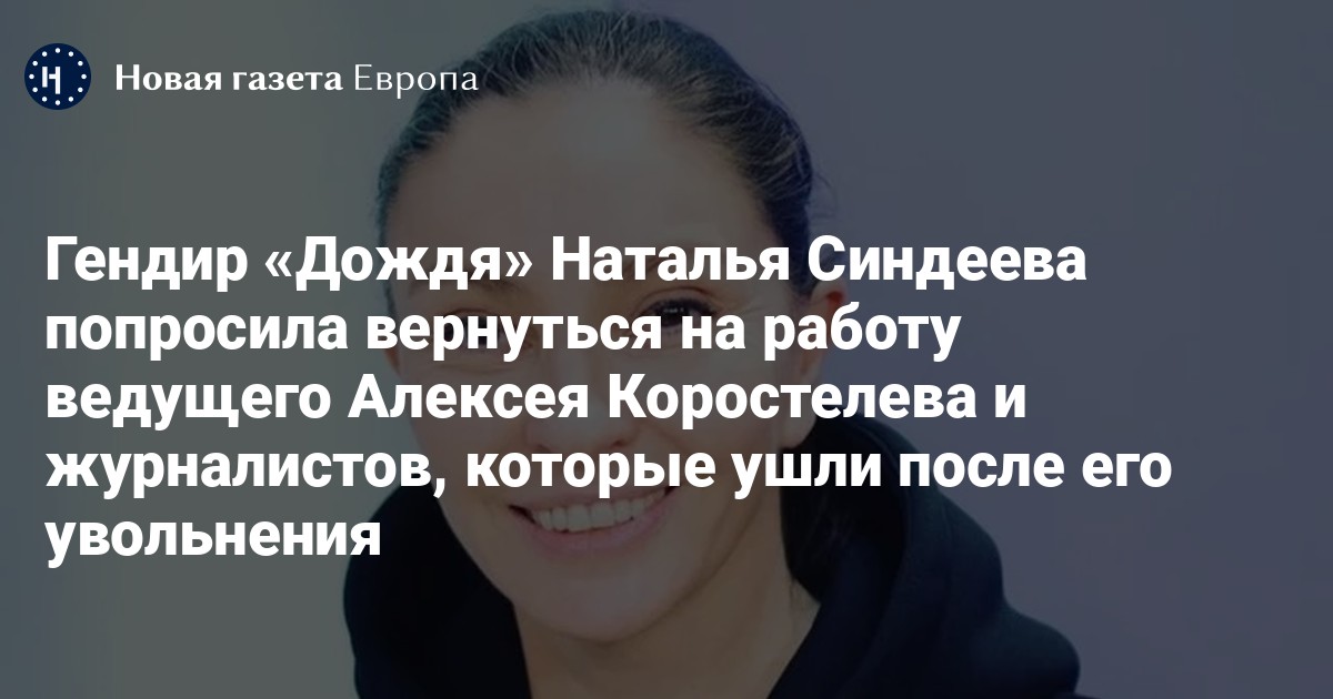 Гендиректор телеканала «Дождь» Наталья Синдеева записала видеообращение, в котором попросила вернуться на работу уволенного ведущего Алексея Коростелева, а также журналистов Маргариту Лютову и Владимира Роменского. Она выложила ролик в своем телеграм-канале.