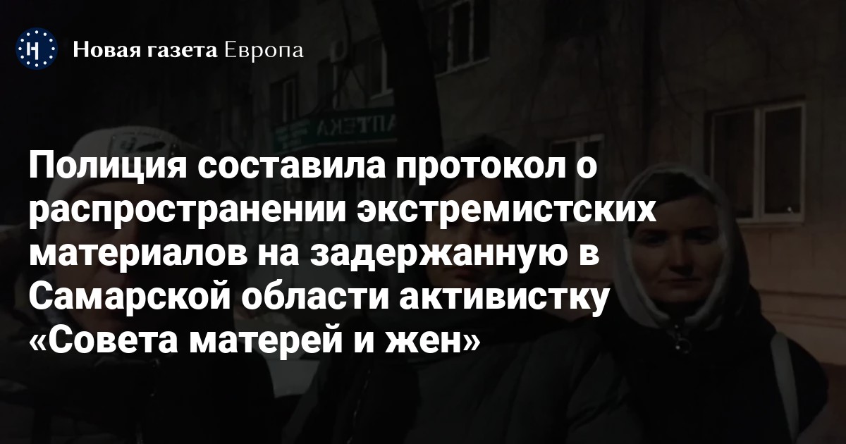 Полиция составила протокол о распространении экстремистских материалов (ст. 20.29 КоАП) на задержанную в Самарской области активистку «Совета матерей и жен» и журналистку издания «Разоблачено» Светлану Белову. Об этом Белова рассказала в видео, опубликованном в телеграм-канале Совета.