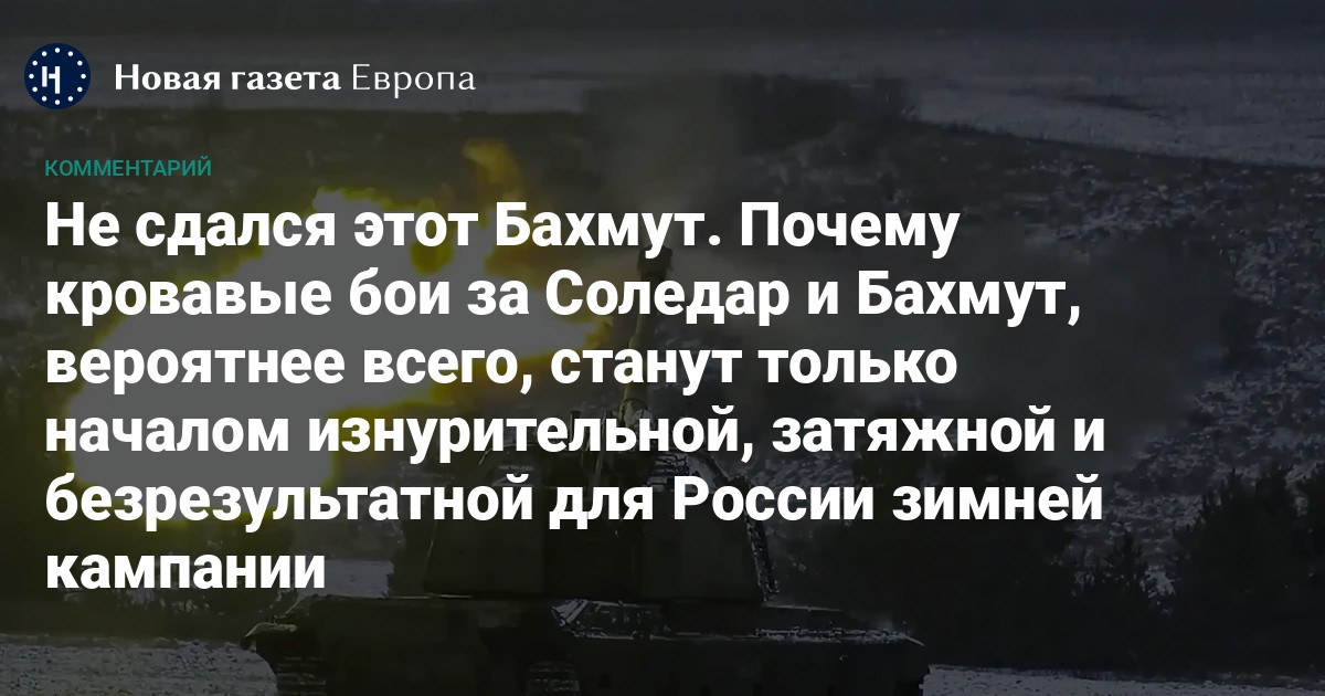 «Даже если город падет, украинцы отступят к следующей линии обороны, заставляя Россию бороться за еще один километр земли», — пишет Музыка. Российские войска должны будут в очередной раз пытаться брать штурмом города, не играющие важной стратегической роли, неся очень тяжелые потери. Но, несмотря на поражение в Харьковской области, российское политическое и военное руководство продолжает ожесточенные попытки прорвать оборону ВСУ в районе Бахмута. По украинским данным, между ним и Соледаром на протяжении примерно 12 километров в декабре 2022 года было сосредоточено около 40 российских батальонно-тактических групп (БТГр) общей численностью от 30 до 40 тысяч человек, главным образом, наемников из так называемой «группы Вагнера», а также из частей ВДВ, дислоцированные в этом районе после вывода с правобережного плацдарма в Херсонской области.