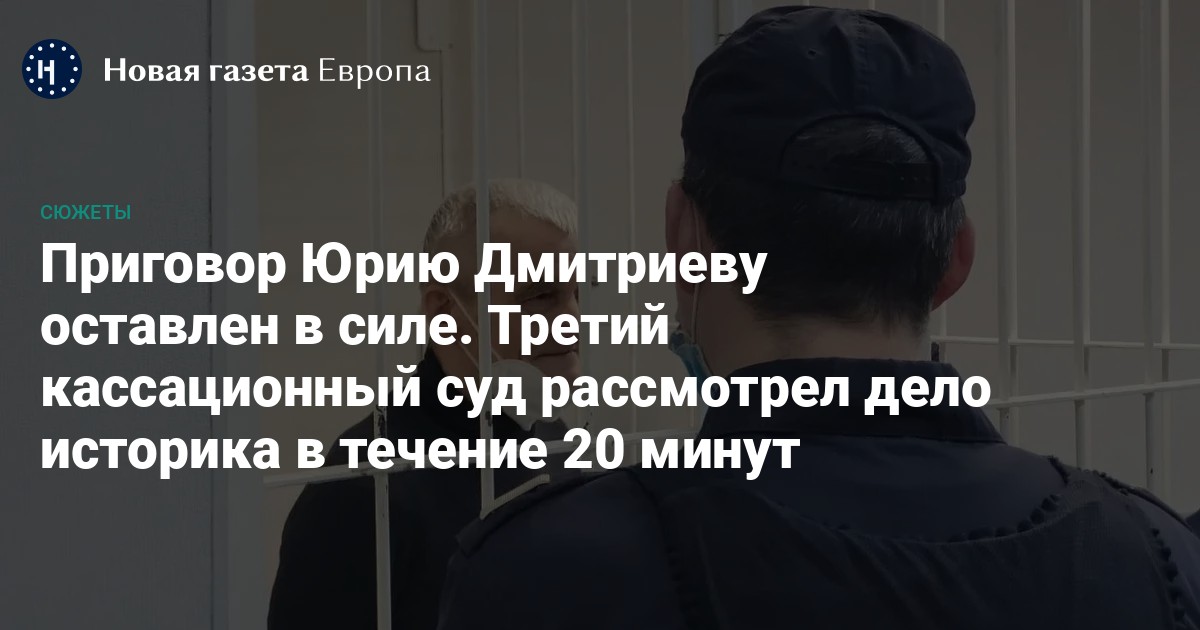 Кассационное заседание Третьего кассационного суда по делу историка, поисковика имен жертв политических репрессий и мест их захоронения Юрия Дмитриева закончилось предсказуемо. Судебная коллегия в составе трех судей оставила приговоры Петрозаводского городского суда от 27 декабря 2021 года и апелляционное определение суда Верховского суда Республики Карелия от 15 марта 2022 года, приговоривших историка к 15 годам лишения свободы, без изменения, а кассационные жалобы осужденного и его защитника — без удовлетворения.