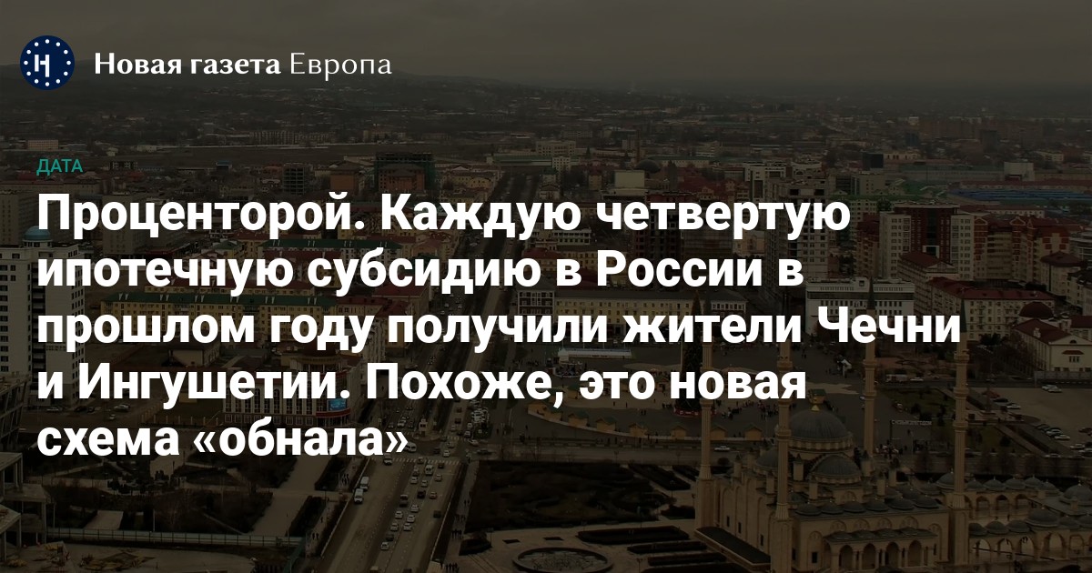 С 2019 года Чечня и Ингушетия получили в 1,7 раза больше субсидий на погашение ипотеки, чем Москва, Подмосковье и Петербург, вместе взятые. Речь о сумме в 36,5 млрд рублей. Это больше годового бюджета Ингушетии. И, скорее всего, связано с обналом госпомощи.