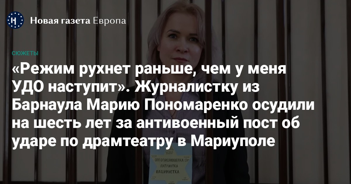 Ленинский районный суд Барнаула приговорил активистку и журналистку Марию Пономаренко к шести годам колонии по делу о военных «фейках». Суд также на 5 лет запретил Пономаренко заниматься журналистской деятельностью. В качестве обвинения следствие предъявило Пономаренко посты в телеграм-канале, в которых говорилось, что российская армия разбомбила драмтеатр в украинском Мариуполе. Марию почти сразу арестовали, она провела около девяти месяцев в СИЗО Петербурга и Барнаула, пережила попытку суицида, позже оказалась под домашним арестом, но потом снова под стражей.