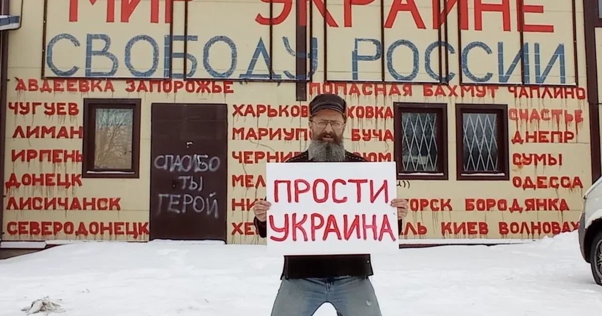 Два дня назад февраля «Дождь» сообщил, что предприниматель вышел в одиночный пикет против в войны Украине у своего магазина в селе Русско-Высоцкое. На фасаде магазина он уже несколько лет размещает протестные лозунги.