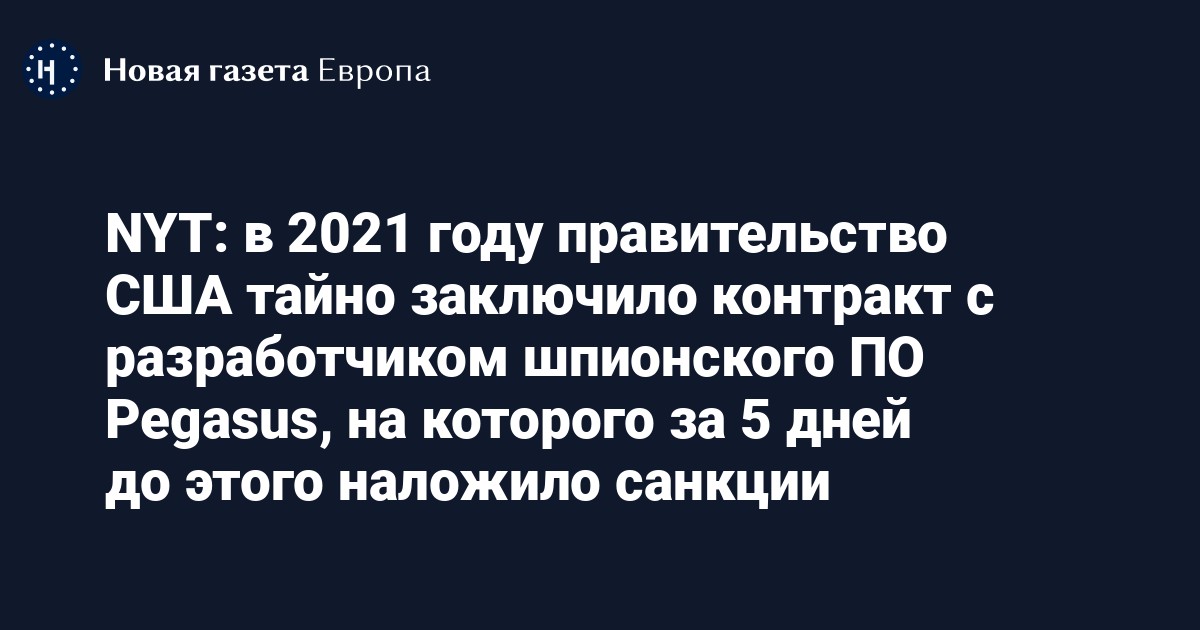 В ноябре 2021 года американское правительство через ряд подставных фирм заключила контракт с израильской компанией NSO Group, на которую за пять дней до этого наложила санкции за разработку шпионского ПО. Об этом сообщает The New York Times, журналисты которого изучили контракт.