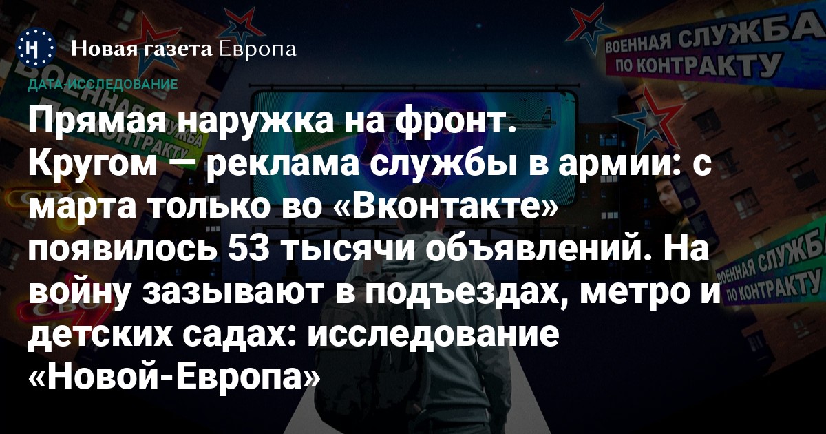Кругом — реклама службы в армии: с марта только во «Вконтакте» появилось 53 тысячи объявлений. На войну зазывают в подъездах, метро и детских садах: исследование «Новой-Европа»