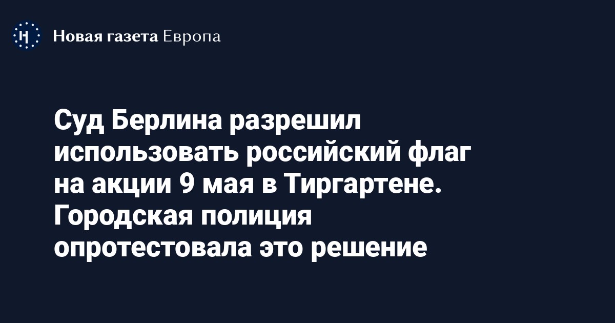 Административный суд Берлина разрешил использовать российский флаг на акции возле советского военного мемориала в районе Тиргартен 9 мая. Об этом сообщила берлинская полиция в твиттере.