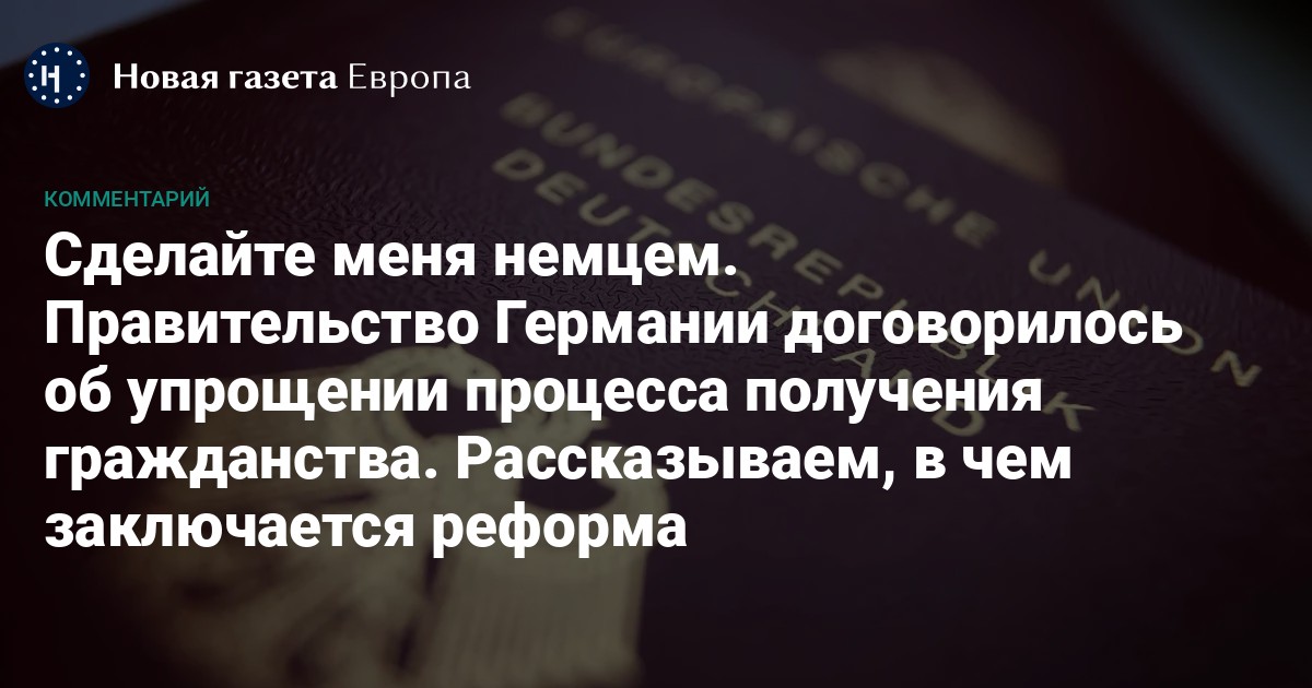 После длившихся несколько месяцев дебатов правящая коалиция в Германии, состоящая из социал-демократов (СДПГ), зелёных и свободных демократов (СвДП), согласовала основные положения законопроекта об упрощенной натурализации. Об этом 19 мая сообщили немецкие СМИ, включая Süddeutsche Zeitung, Die Welt и Tagesschau, со ссылкой на 49-страничный документ, подготовленный федеральным министром внутренних дел ФРГ Нэнси Фезер из СДПГ.