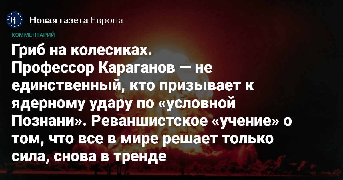 И здесь мы должны, наоборот, Караганова поблагодарить. В его свежем тексте нет ничего ни оригинального, ни шокирующего. Мысль, что ради недопущения полномасштабной ядерной войны необходимо всерьез продемонстрировать готовность к суицидальному ответу, восходит и к идее «деэскалации через эскалацию», и к «теории безумца» президента Никсона времен Вьетнамской войны.