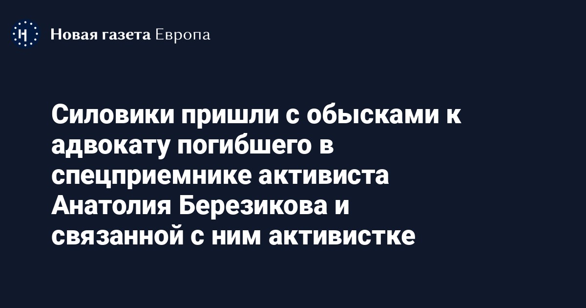 Силовики пришли с обысками к адвокату погибшего в спецприемнике Анатолия Березикова — Ирине Гак — и к общественной защитнице Татьяне Спорышевой. Об этом сообщают «ОВД-Инфо» и «Первый отдел».