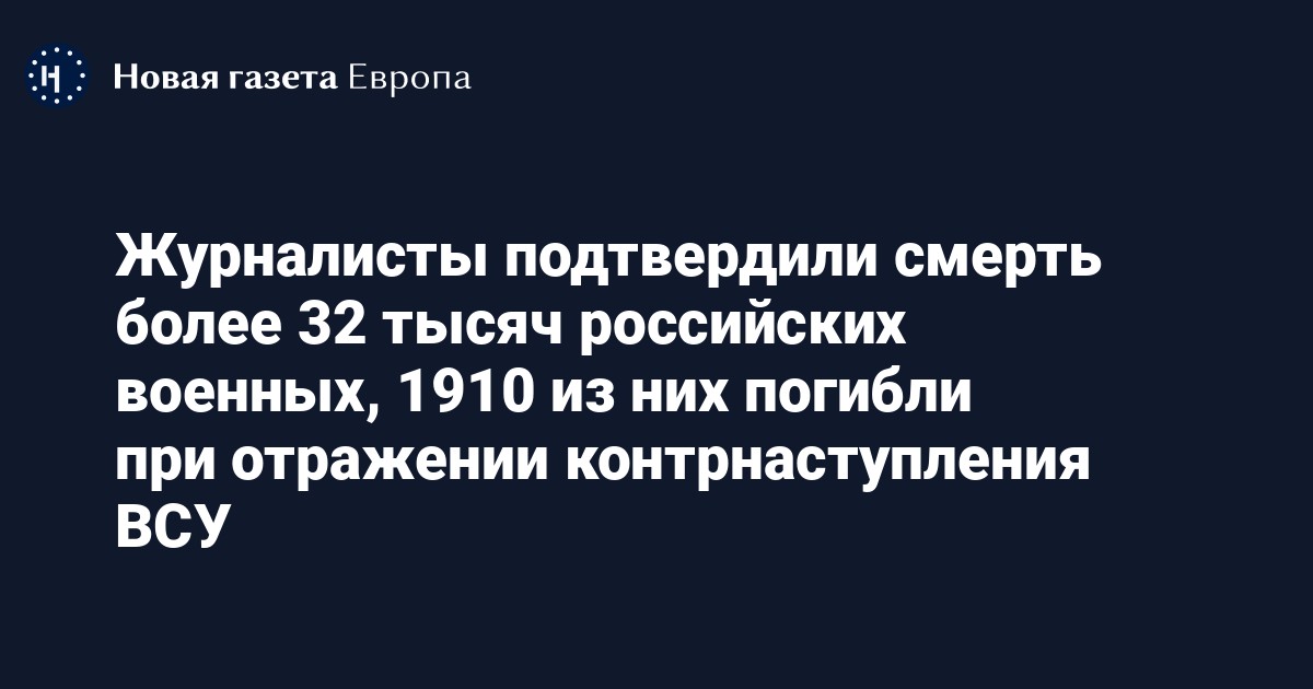 Как минимум 1910 российских военных погибли, отражая контрнаступление армии Украины, всего же с начала войны удалось выяснить личности 32 164 погибших солдат. Такие данные опубликовали журналисты Русской службы «Би-би-си» и «Медиазоны» после анализа открытых источников.