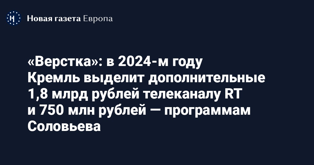 «Верстка»: в 2024-м году Кремль выделит дополнительные 1,8 млрд рублей телеканалу RT и 750 млн рублей — программам Соловьева