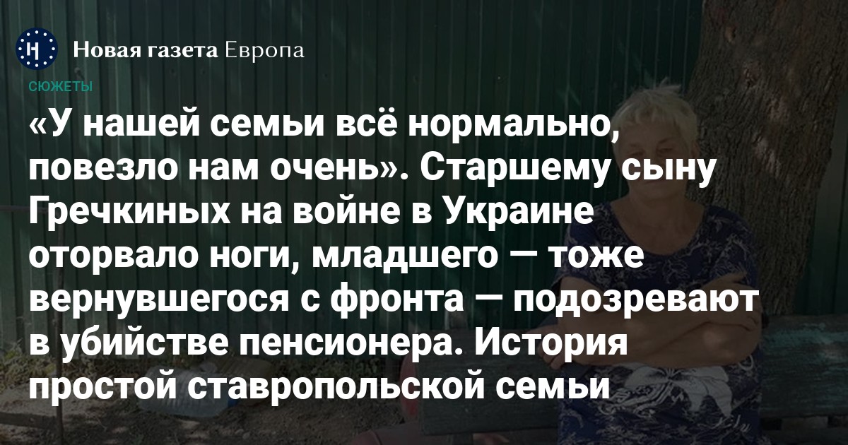 — Артёмка приехал в марте с Украины, — рассказывает Наталья Гречкина, мама российского военнослужащего. — Хотел снова туда поехать, куда-то на Запад, я не выговорю это название. Мы не пустили. А через две недели милиция забрала его. Говорят, ограбил и убил. Как? У него были деньги, он 300 тысяч привез. Всё больше дома он был, мы ему кобылку купили. В тот день он говорит: «Мамочка, можно я на кобыле покатаюсь?» Она вредная была, поэтому я попросила, чтоб потихоньку. Три пацана к нему в гости пришли. Я их первый раз-то и видела. Вот они взяли коней и поехали. Я на огороде копалась, смотрю — опера приехали, спросили, где Артём. Ну я объяснила, где он есть. А потом пацаны пригоняют коней и говорят: «Артёма посадили, всё, его забрали». Больше я Артёма не видела. То он хотя бы звонил, а вот уже месяца полтора-два связи с ним нет…