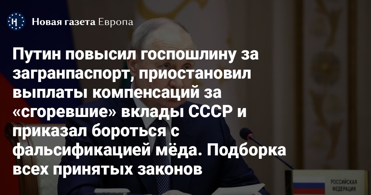 Путин повысил госпошлину за загранпаспорт, приостановил выплаты компенсаций за «сгоревшие» вклады CCCР и приказал бороться с фальсификацией мёда. Подборка всех принятых законов