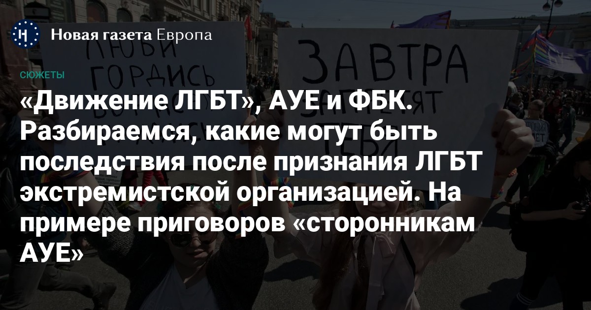 Высшая судебная инстанция удовлетворила требование Министерства юстиции РФ признать «международное движение ЛГБТ» экстремистской организацией и запретить его деятельность на территории страны. Это не первый такой запрет российских судов: до этого уже признавали экстремистским «движение АУЕ» — оно также не имело устава, четкой иерархии или формальных руководителей, и его представители не были организованы в единую структуру. Доказательством участия в «запрещенной организации» может служить практически любое обстоятельство. «Новая-Европа» попыталась разобраться, к чему стоит готовиться после признания «движения ЛГБТ» экстремистской организацией.