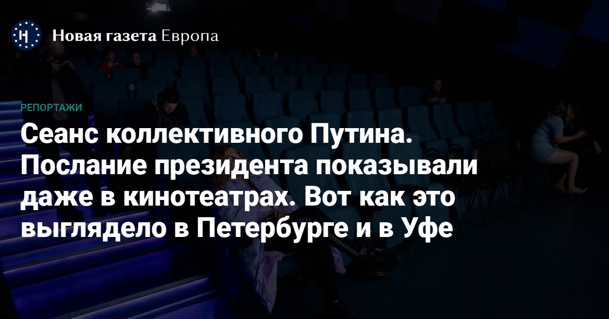 Впервые в этом году (выборном, что, безусловно, случайность) в России рискнули показать послание президента страны Федеральному Собранию не только в прямом эфире по телевидению и онлайн, но и в кинотеатрах. Однако публичный эксперимент провалился с оглушительным треском — послушать и посмотреть на Путина на большом экране, с яркой картинкой и хорошим звуком, в удобных креслах, с кофе и поп-корном, даже бесплатно (билеты не продавались — вход был свободным) как в столицах, так и в провинции сегодня не пришел почти никто.