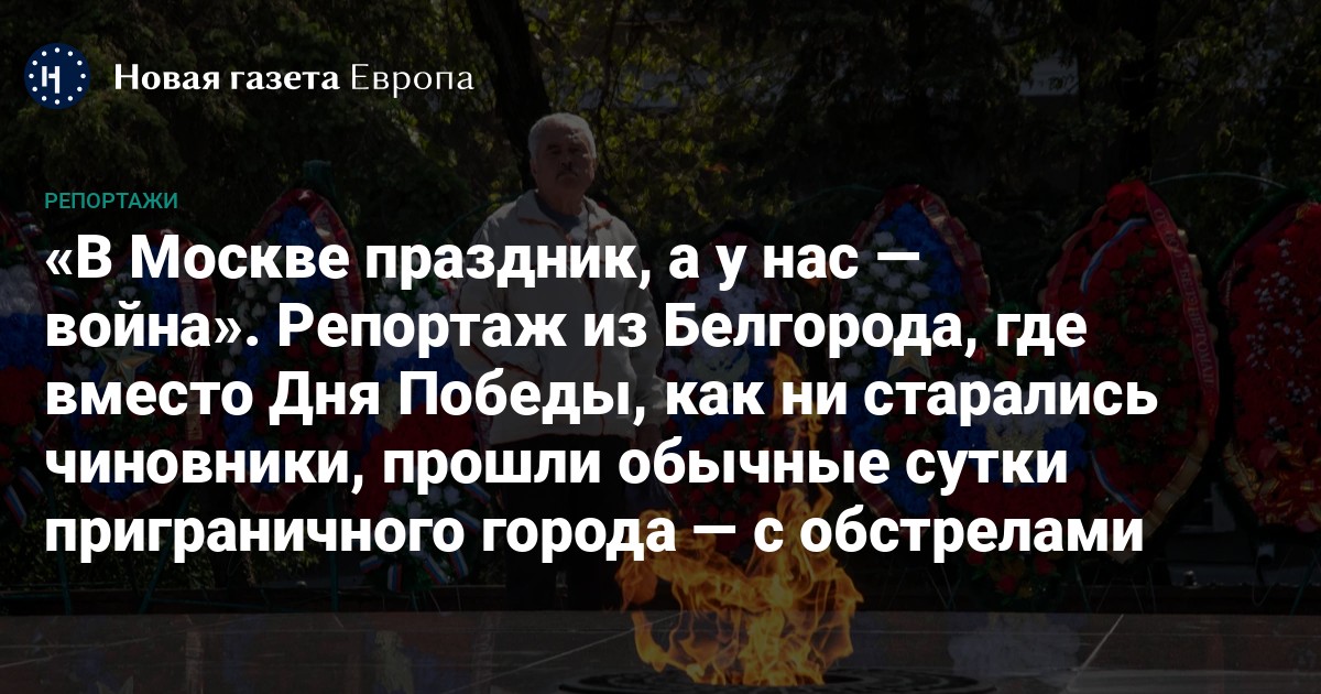 «11 раненых — в Белгороде, одна погибшая — в Новой Таволжанке — вот такой у нас день Победы», «в Москве — сегодня салют, а у нас — свои “салюты”», «день Победы — а город пуст», — с утра 9 мая с грустью писали в городских чатах белгородцы и после ночных обстрелов со стороны ВСУ не спешили покидать свои дома. По меньшей мере, до полудня солнечный, пышно цветущий и празднично украшенный город выглядел если не вымершим, то крепко уснувшим. Редкие машины пролетали по городским магистралям. Только ветер гулял по пустым аллеям в Парке Победы. Никого не удалось встретить на центральных улицах, где раньше, с рассвета до заката 9 мая, играл духовой оркестр, звучали фронтовые песни, кормили солдатской кашей. Даже у Вечного огня на главной площади города — Соборной — ни души, кроме нескольких скучающих полицейских, бойцов теробороны и двух бригад «Скорой помощи». Здесь, правда, для создания соответствующей атмосферы крутили репертуар от Марка Бернеса до Олега Газманова.