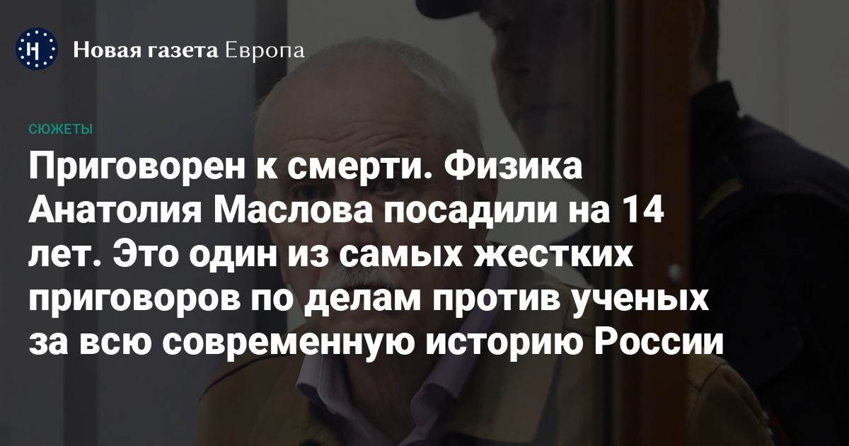 Санкт-Петербургский городской суд приговорил к 14 годам строгого режима 77-летнего физика Анатолия Маслова. Если он доживет до окончания срока, ему будет за 90. Ведущий специалист по гиперзвуку, продержанный в изоляторах ФСБ почти два года, так и не признал вину в госизмене.