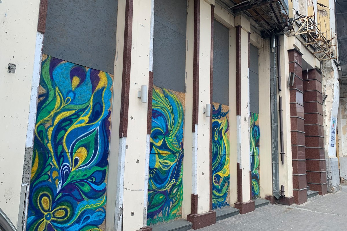 Щиты из фанеры, прикрывающие выбитые обстрелами окна, превращенные в арт-объекты в центре Харькова. Фото: Ольга Мусафирова / «Новая газета Европа»