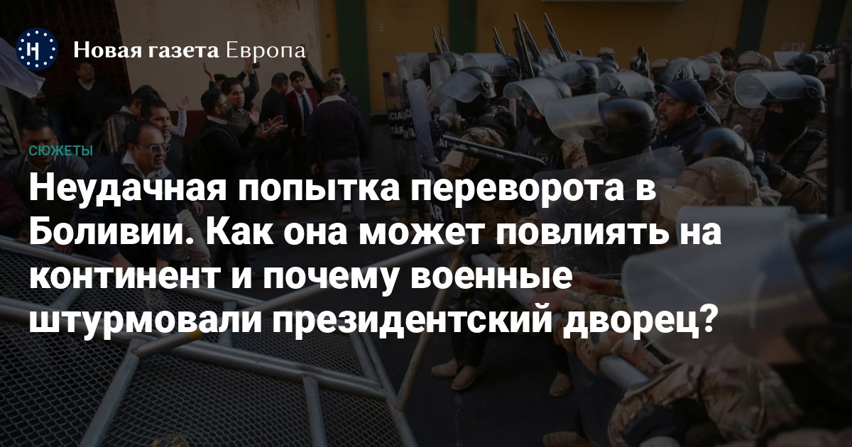 26 июня боливийский генерал Хуан Суньига попытался осуществить военный переворот. За день до этого он был отстранен от командования армией за угрозу арестовать бывшего президента страны Эво Моралеса. Он «больше не может быть президентом», заявил Суньига и подчеркнул, что не позволит ему «попирать конституцию». Моралес, возглавлявший страну с 2006-го по 2019 годы, ответил постом с критикой нынешнего президента Луиса Арсе: «Если они [эти слова] не будут опровергнуты главнокомандующим вооруженными силами, министром обороны, президентом и генерал-капитаном вооруженных сил, будет доказано, что на самом деле они санкционируют самопереворот».