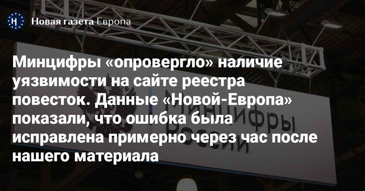 Минцифры «опровергло» наличие уязвимости на сайте реестра повесток. Данные «Новой-Европа» показали, что ошибка была исправлена примерно через час после нашего материала