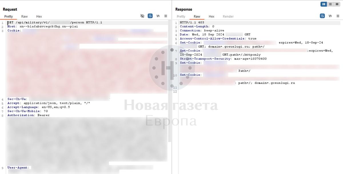 Ответ сайта на запрос о получении данных до исправления уязвимости (фото 1) и после исправления ошибки (фото 2). Для просмотра второго скришота листайте вправо. Скриншоты: «Новая газета Европа».