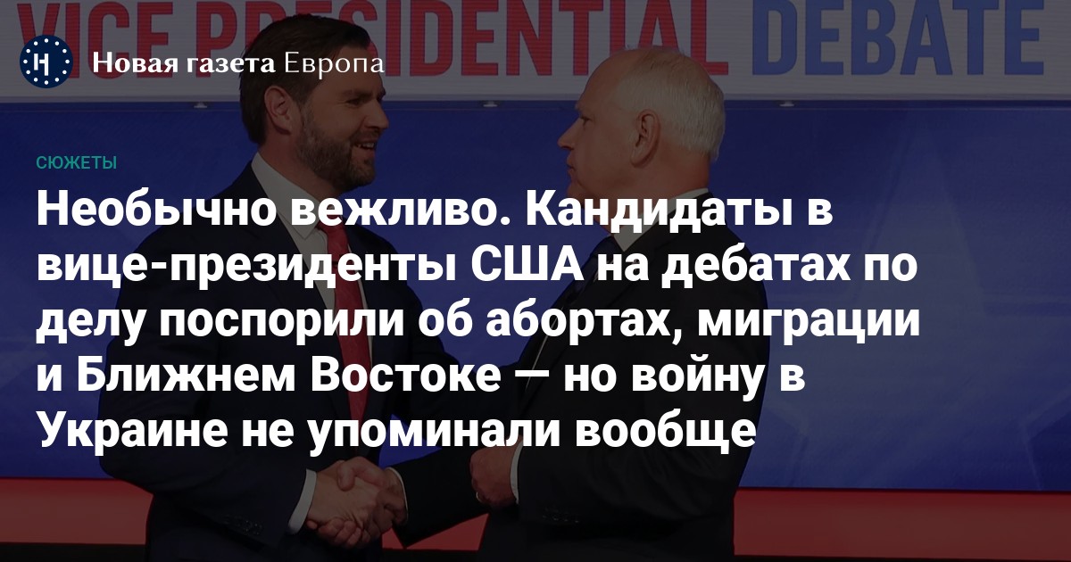 60-летний Уолз, либеральный губернатор Миннесоты и бывший школьный учитель, и 40-летний Вэнс, консервативный сенатор от Огайо, обозначили себя представителями Среднего Запада с глубоко противоположными взглядами на проблемы, волнующие страну. Они дискутировали в основном по внутренним вопросам, а тема войны в Украине осталась в стороне.