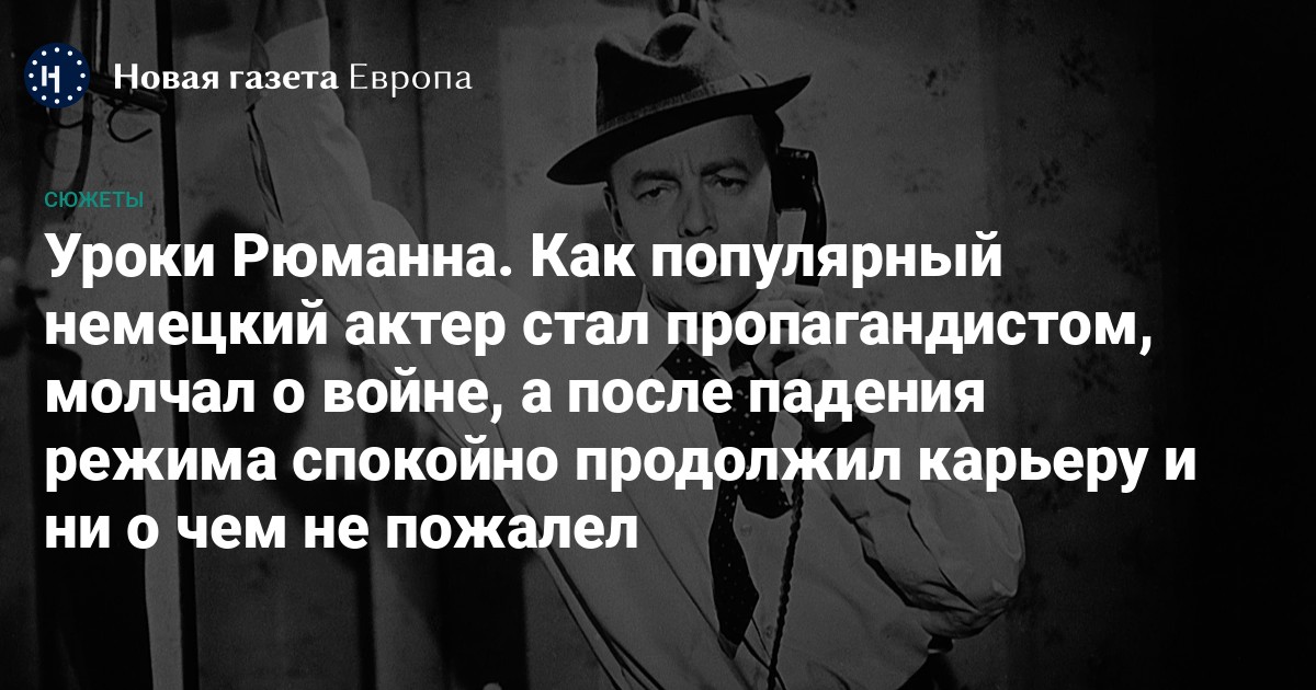 3 октября исполняется тридцать лет со дня смерти Хайнца Рюманна, немецкого артиста, прожившего долгую жизнь, он умер в 92 года. Актером он был заметным, но его судьба заслуживает внимания русскоязычного читателя из-за его карьеры в период с 1933 по 1945 годы и того, что случилось потом. При обсуждении молчания и провоенных высказываний российских «деятелей культуры» в ходе вторжения России в Украину следует держать в голове случай Хайнца Рюманна.