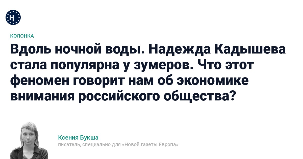 Внезапно у зумеров вошла в моду Надежда Кадышева. Шестидесятипятилетнюю певицу перепевают в тиктоке, билеты на ее концерты раскупают, гонорары за выступления выросли почти в пять раз, а экс-солистка группы «Сливки» Карина Кокс выступает на шоу «Точь-в-точь» на «Первом канале» в образе Кадышевой с песней «Плывет веночек». Что нашла молодежь в фольклорной певице из девяностых? Писательница Ксения Букша — о том, как популярность Кадышевой стала хорошей иллюстрацией экономики внимания (а значит, влияния) в современном обществе, в частности в российском.