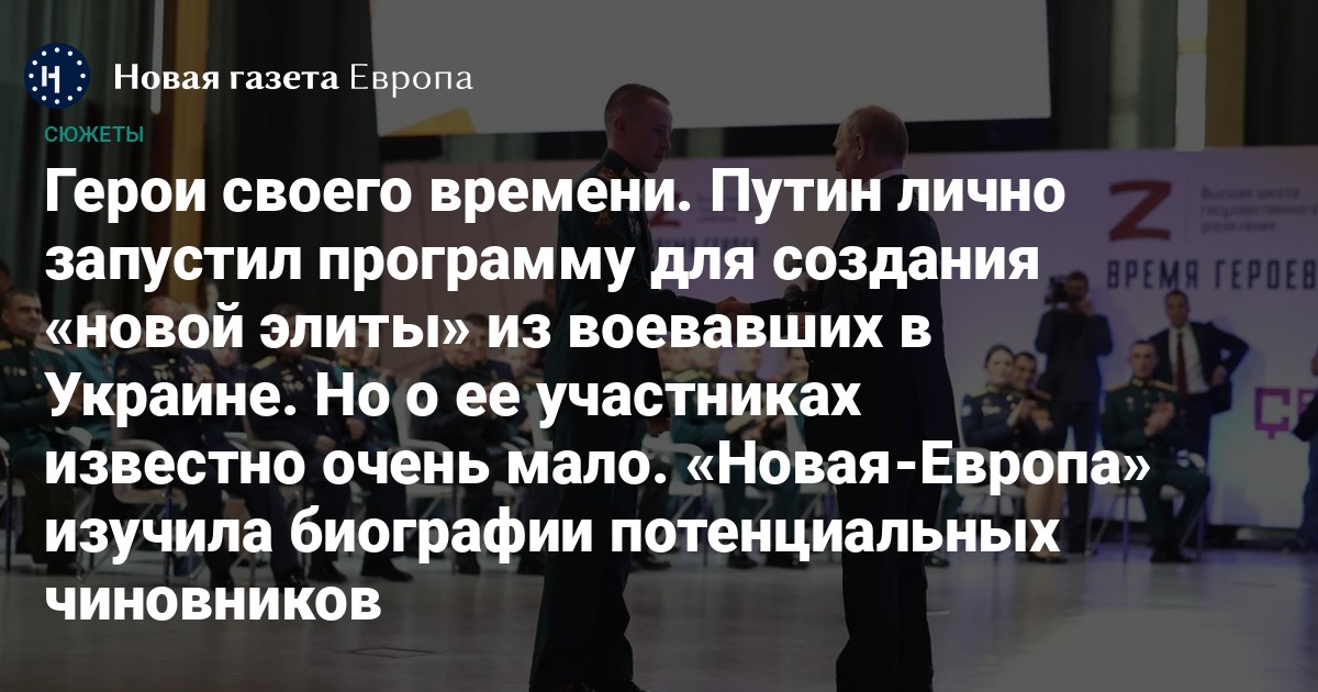 По подсчетам «Новой-Европа», в первый же набор «Времени героев» — программы, которая была создана как карьерный лифт для «бойцов «СВО»», — попали как минимум 18 человек, уже имевших обширный опыт работы в государственных органах, парламентах или силовых невоенных структурах. Это больше 20% от всего числа участников программы.
