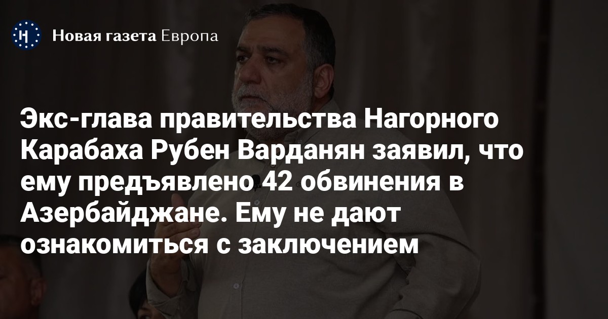 Бывшему главе правительства самопровозглашенной Нагорно-Карабахской республики Рубену Варданяну, находящемуся под арестом в Азербайджане, предъявлено 42 обвинения, некоторые из которых предусматривают пожизненное заключение. Об этом сам бизнесмен сообщил в своем официальном заявлении перед судебным процессом, который начнется завтра, 17 января.